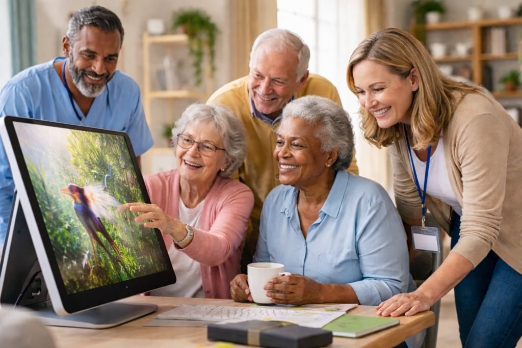 - Memory care residents who need familiar themes, calming content, and simple prompts